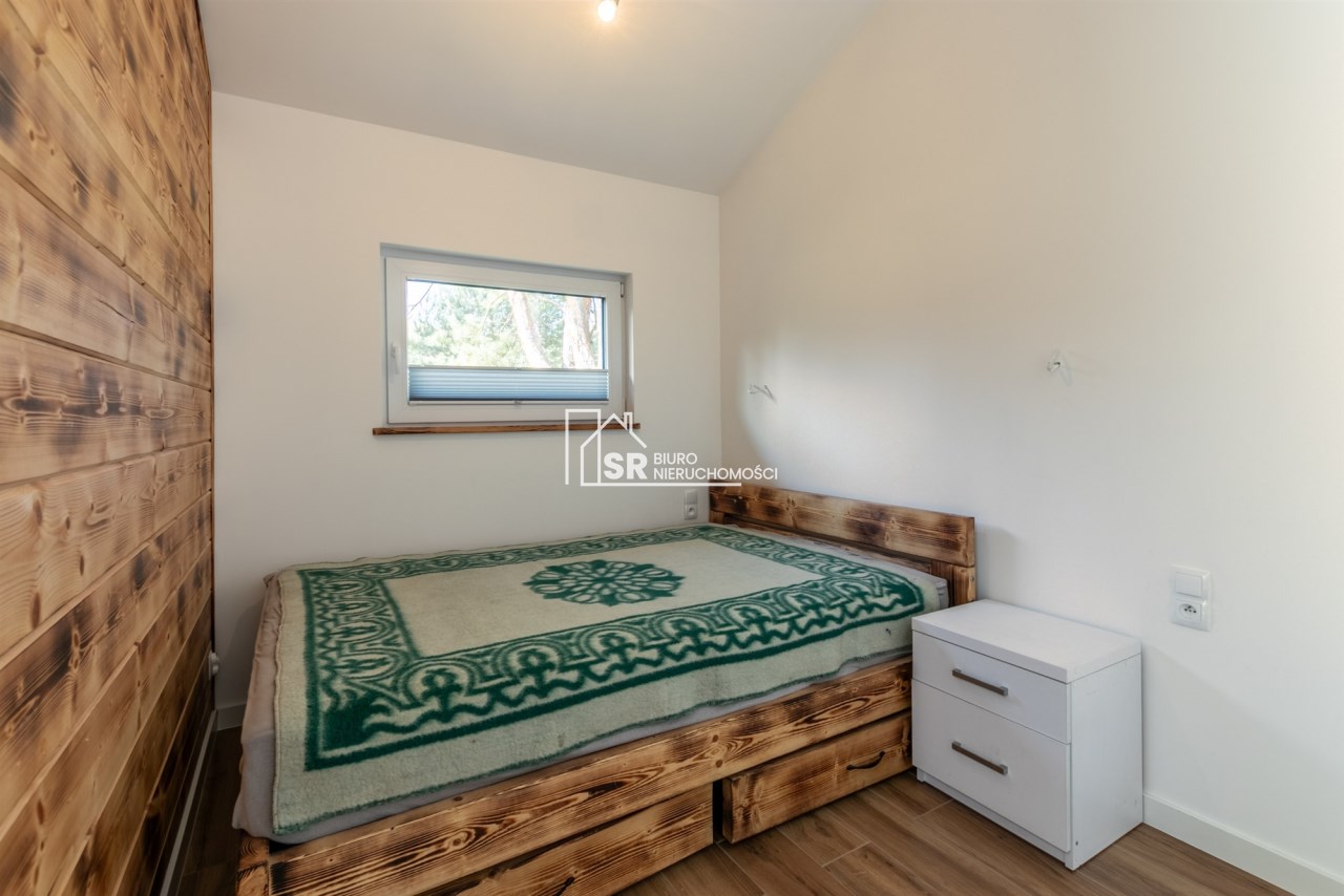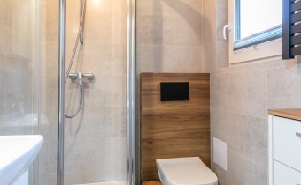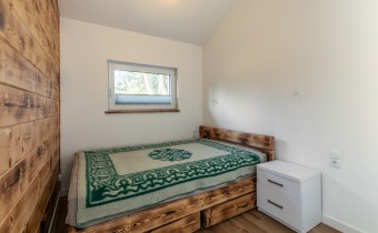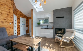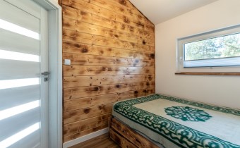 W domku znajduje się salon z kuchnią, sypialnia oraz łazienka z wc.