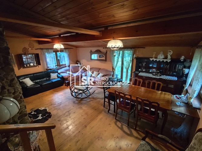 Dom posiada przestronny, klimatyczny salon z kominkiem, którego kamienna obudowa nadaje wnętrzu przytulny, góralsko-letniskowy charakter. Drewniane sufity i podłogi tworzą wyjątkowy nastrój, a liczne okna zapewniają naturalne oświetlenie oraz widok na otaczającą zieleń.