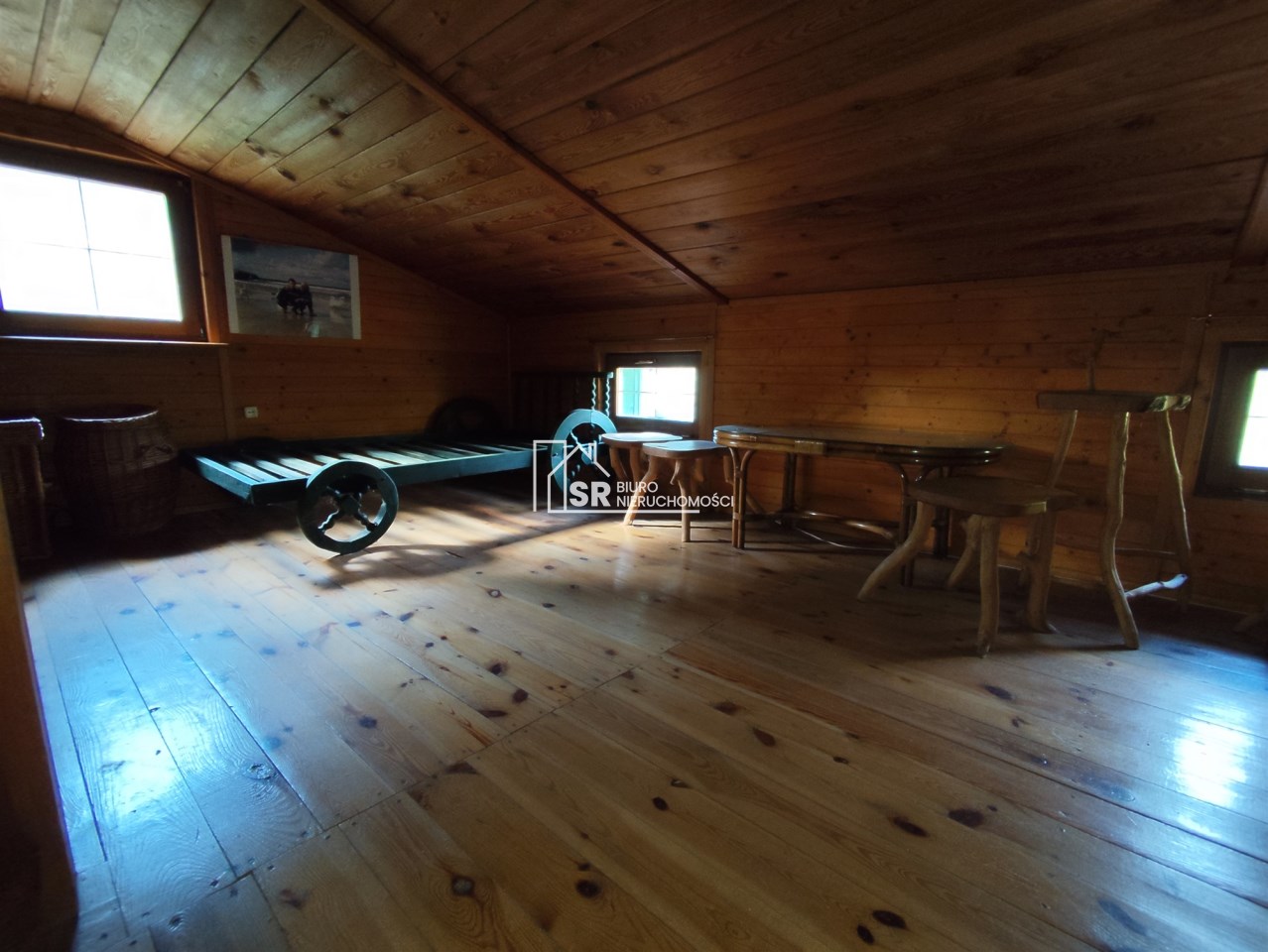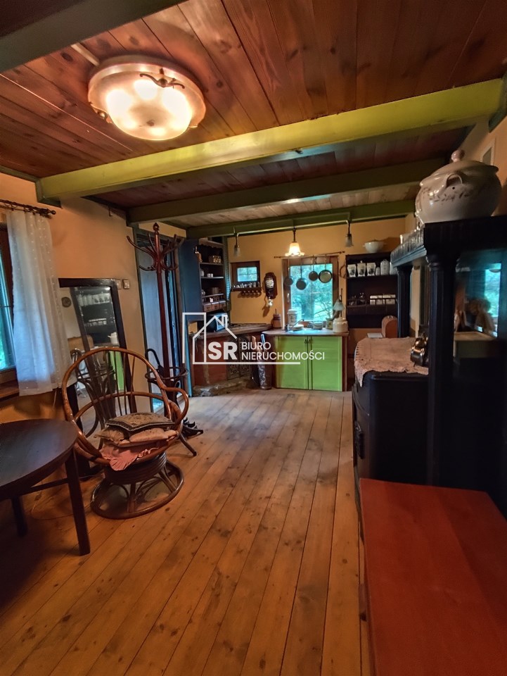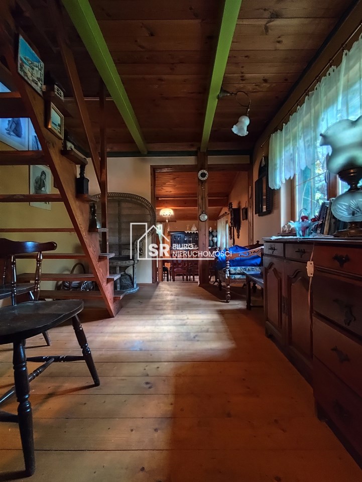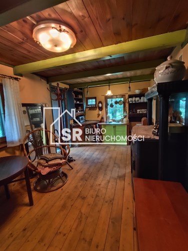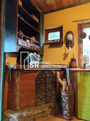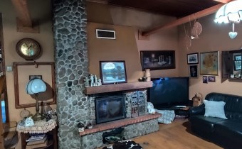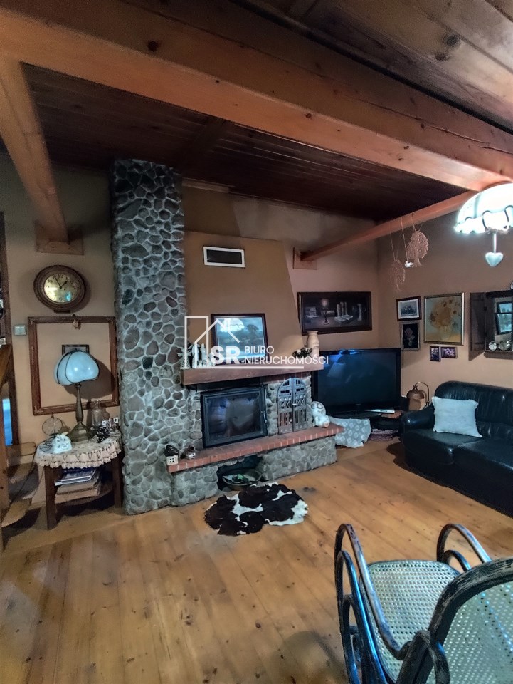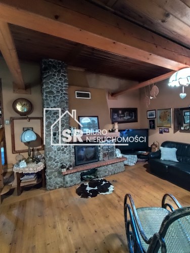 Dom posiada przestronny, klimatyczny salon z kominkiem, którego kamienna obudowa nadaje wnętrzu przytulny, góralsko-letniskowy charakter. Drewniane sufity i podłogi tworzą wyjątkowy nastrój, a liczne okna zapewniają naturalne oświetlenie oraz widok na otaczającą zieleń.