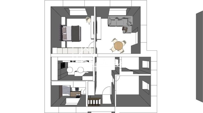 Składa się z salonu, 3 sypialni, kuchni, łazienki.