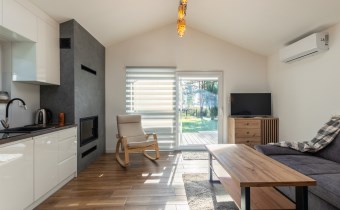 W domku znajduje się salon z kuchnią, sypialnia oraz łazienka z wc.