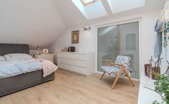 - sypialnia główna połączona z garderobą, jest też przejście z garderoby do łazienki;