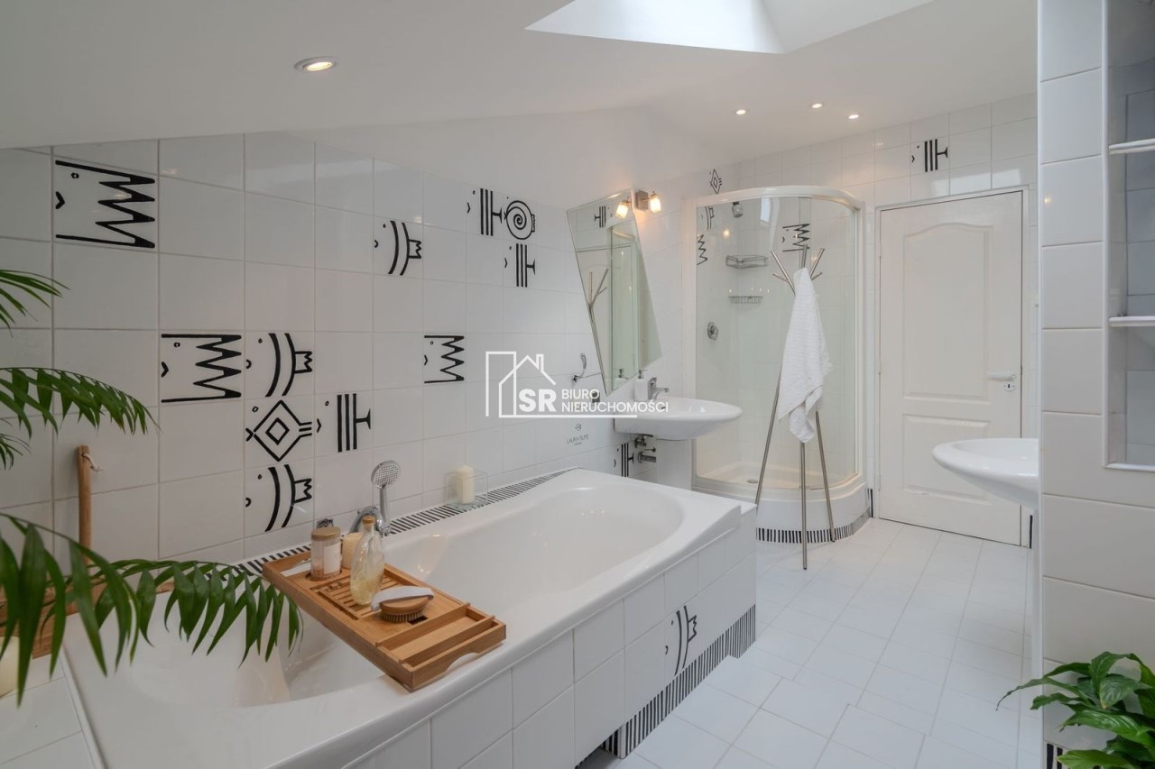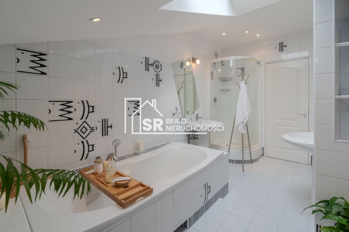 - pokój kąpielowy - wanna, natrysk, toaleta, okno dachowe, glazura, terakota, do łazienki jest przejście z garderoby, ale również wejście z przedpokoju;