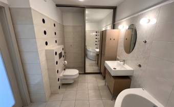 - ŁAZIENKA I, z wanną i prysznicem: 12,44 m², obok głównej sypialni, z wanną narożną i kabiną prysznicową, pralnia oddzielona drzwiami przesuwnymi z lustrem, przygotowane podłączenie pralki oraz słuchawka bidetowa,