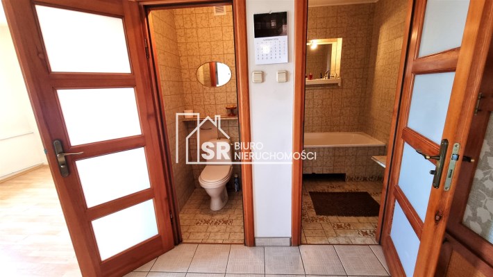 WC osobno, starsza glazura i terakota, sedes, umywalka, nowoczesne drzwi drewniane z przeszkleniami
