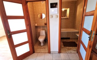 WC osobno, starsza glazura i terakota, sedes, umywalka, nowoczesne drzwi drewniane z przeszkleniami