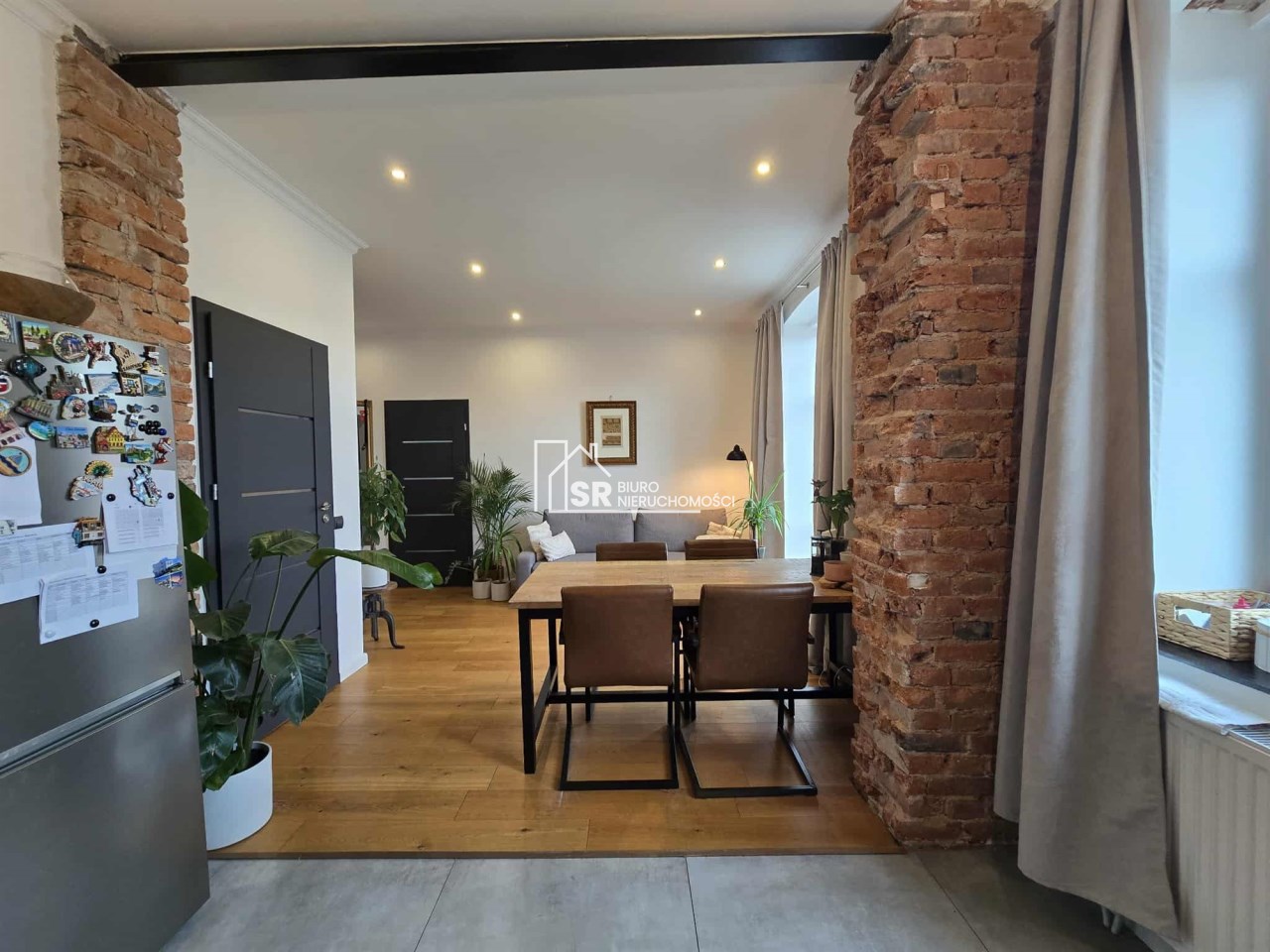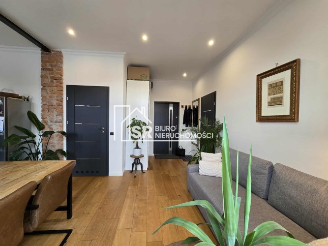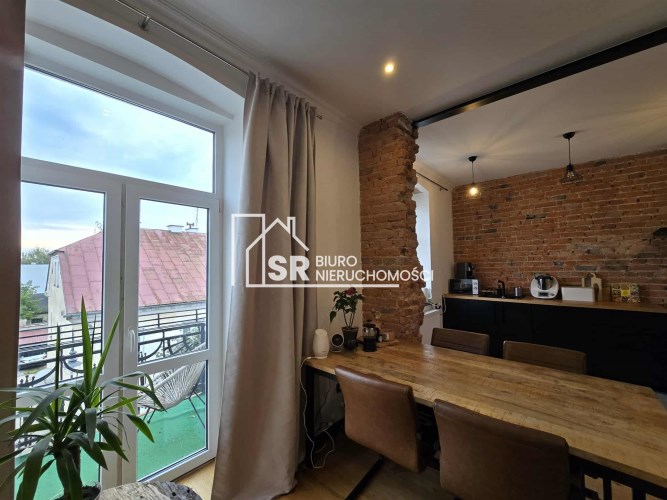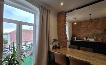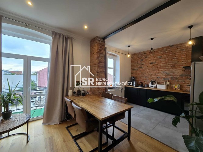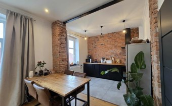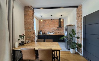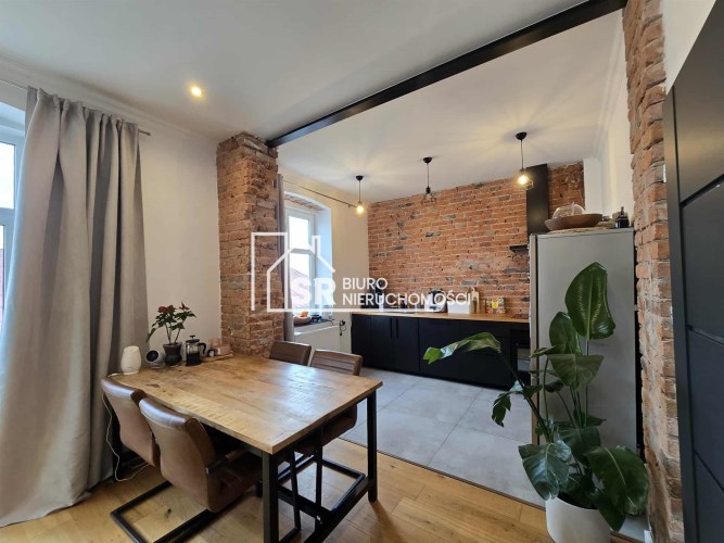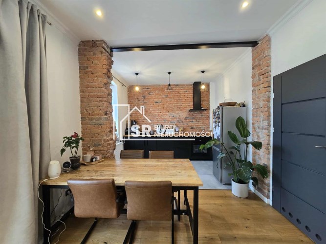 Stylu nadają podłogi wyłożone deską barlinecką, ozdobna cegła na ścianach nadaje charakteru wnętrzu. Oryginalne, drewniane stoły i meble pozostają na wyposażeniu mieszkania.