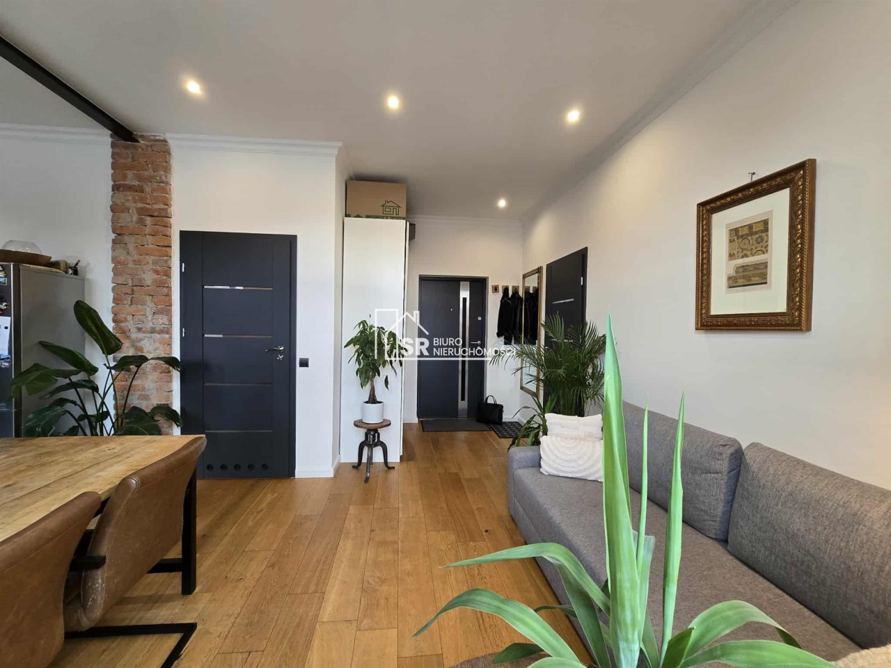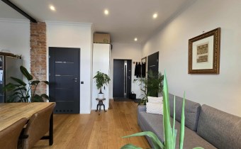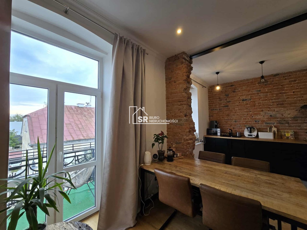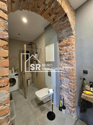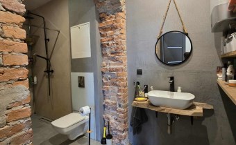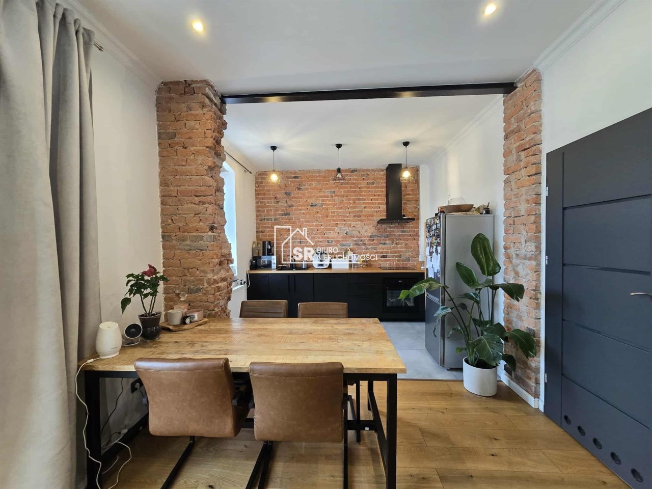 Stylu nadają podłogi wyłożone deską barlinecką, ozdobna cegła na ścianach nadaje charakteru wnętrzu. Oryginalne, drewniane stoły i meble pozostają na wyposażeniu mieszkania.