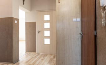 Mieszkanie zostało odmalowane w kolorach beżu, na podłogach leżą panele.