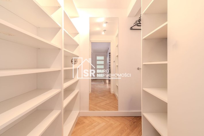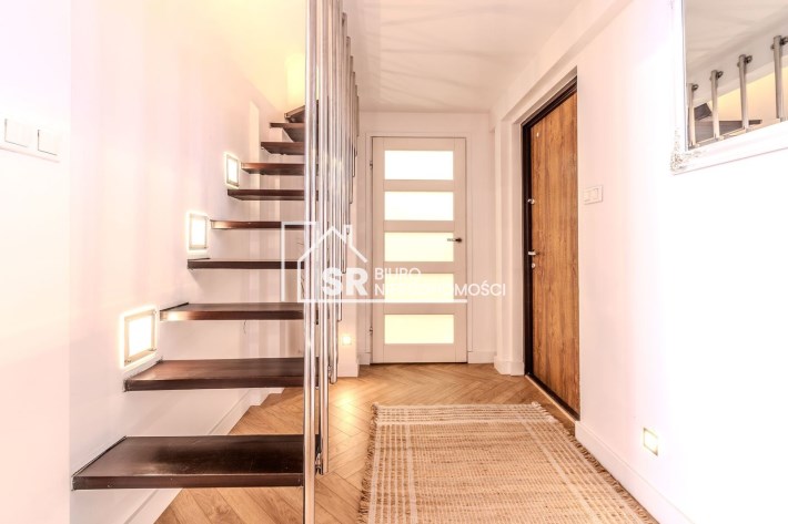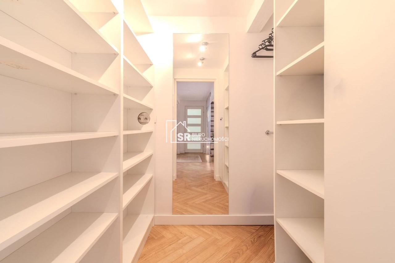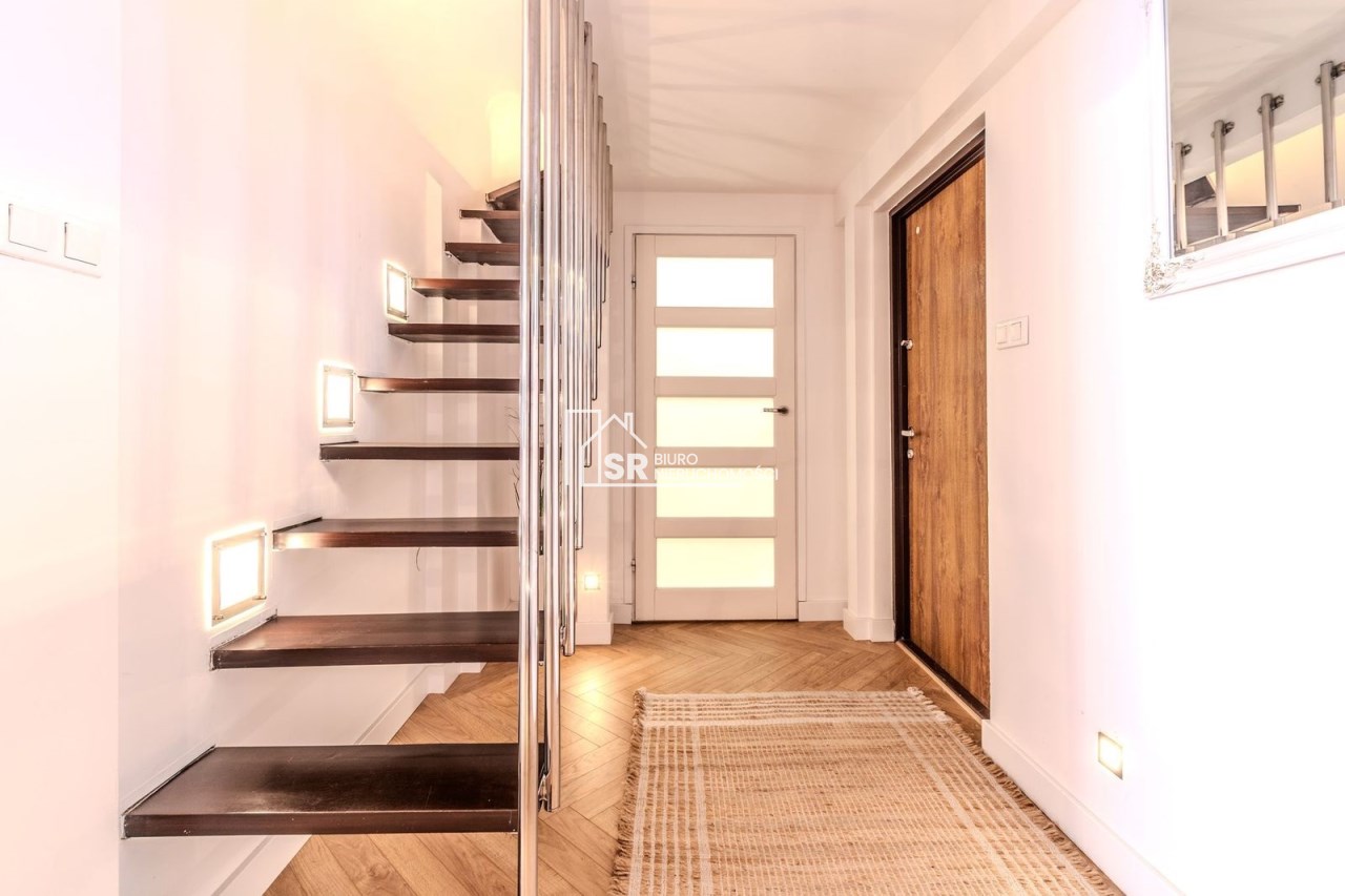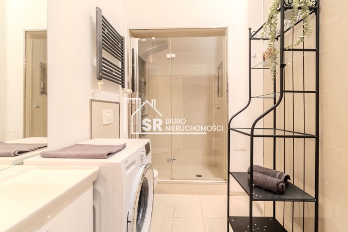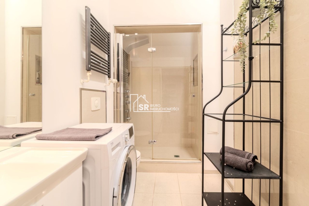 Salon: sofa narożna z funkcją spania, fotel rozkładany, komoda, dwa stoliki kawowe, dywan, telewizor 55 " z funkcją smart TV, nagłośnienie - listwa i sound bar JBL. Sypialnia: łóżko z materacem 140 cm szerokości, dwa stoliki nocne, zasłony zaciemniające. Kuchnia: meble - zabudowa na wymiar, stół okrągły, krzesła, zmywarka, piekarnik, płyta indukcyjna, lodówka z podajnikiem wody, zastawa stołowa, garnki. Garderoba: półki i drążki na wieszaki, szafka zamykana, duże lustro. Łazienka: duża kabina natryskowa, pralka, umywalka z szafką, lustro, regał. Antresola. Nowe drzwi przesuwane między salonem, sypialnią i kuchnią.