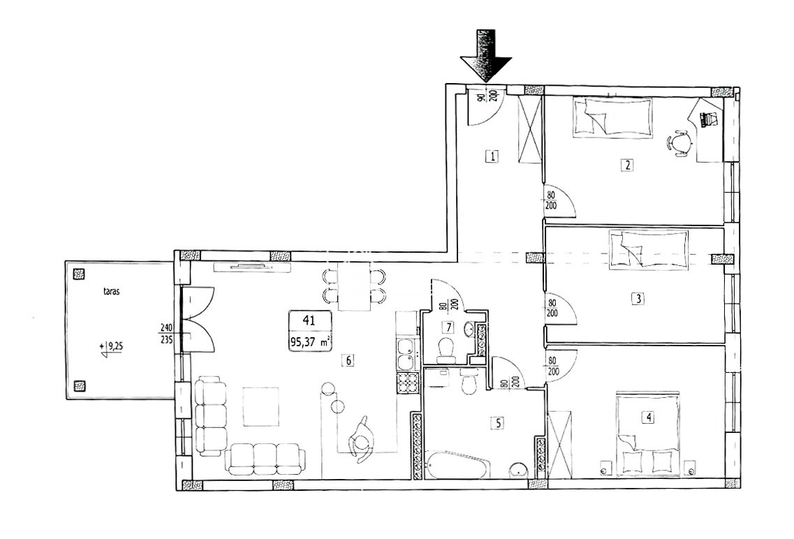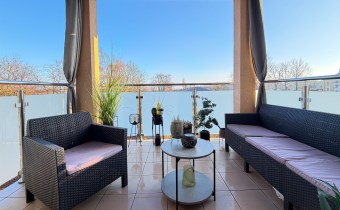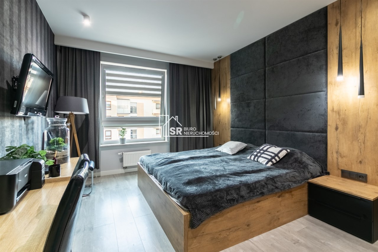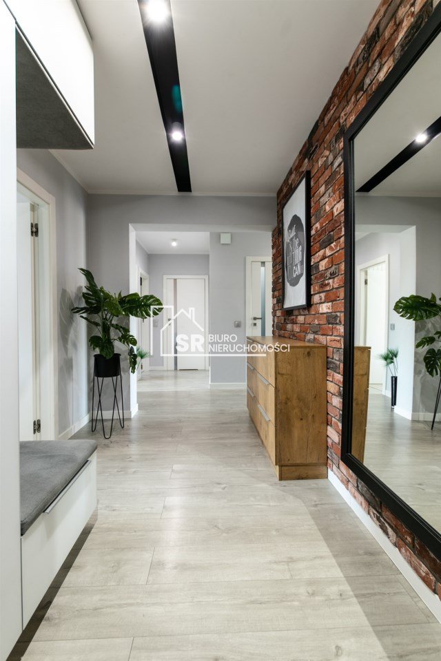 Mieszkanie o powierzchni 95,37 m² i znajduje się trzecim piętrze budynku z windą. Składa się z salonu połączonego z aneksem kuchennym, pomieszczenia gospodarczego (spiżarnia), trzech sypialni, łazienki z wc. Całość została urządzona w eleganckim i nowoczesnym standardzie.