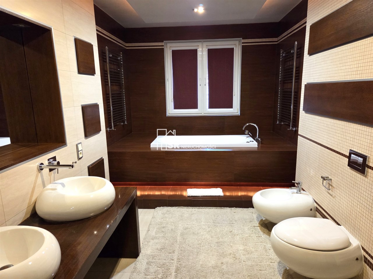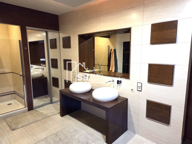 - pokój kąpielowy o powierzchni ok. 16 m2, wyposażony w wannę, prysznic, dwie umywalki oraz bidet.