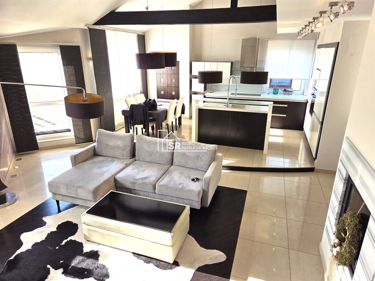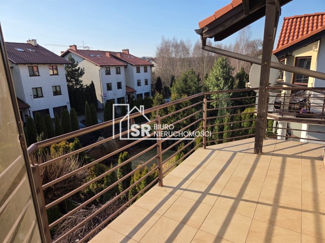 - obszerny salon z kominkiem o powierzchni prawie 29 m2 z wyjściem na duży balkon,