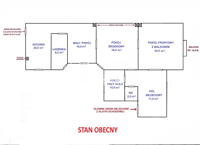 Powierzchnia pokoi 42;34,8;16;14,4 m2