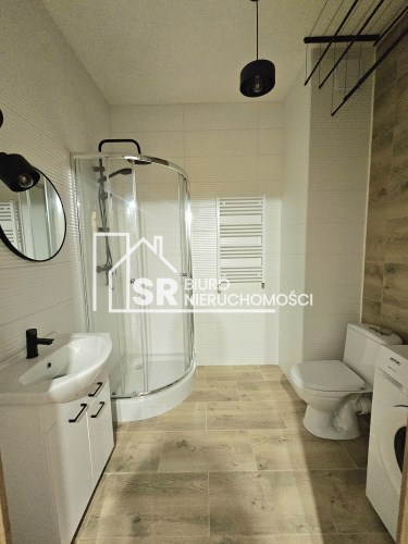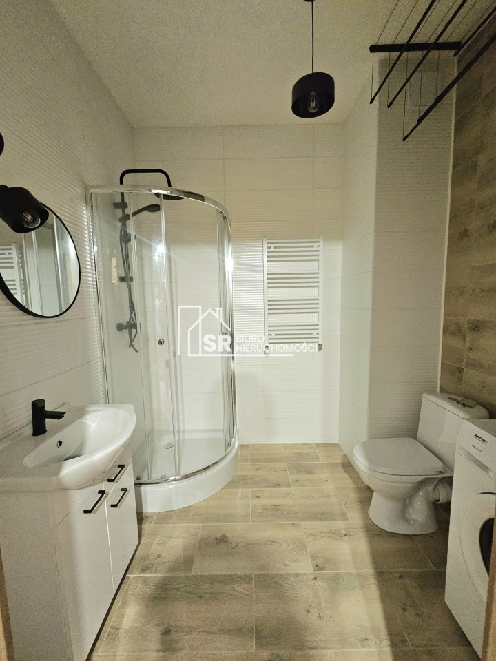 W łazience o powierzchni 4,31m2 znajduje się pralka, wc, kabina prysznicowa, umywalka na szafce a także lustro. W Przedpokoju znajduje się szafa, zaś w salonie komoda i łóżko.