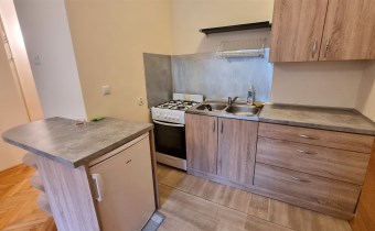 - I POKÓJ:  z aneksem kuchennym ok. 18 m kw, podłoga parkiet po cyklinowaniu, ściany gładzie gipsowe, malowane, kanapa, regał ,