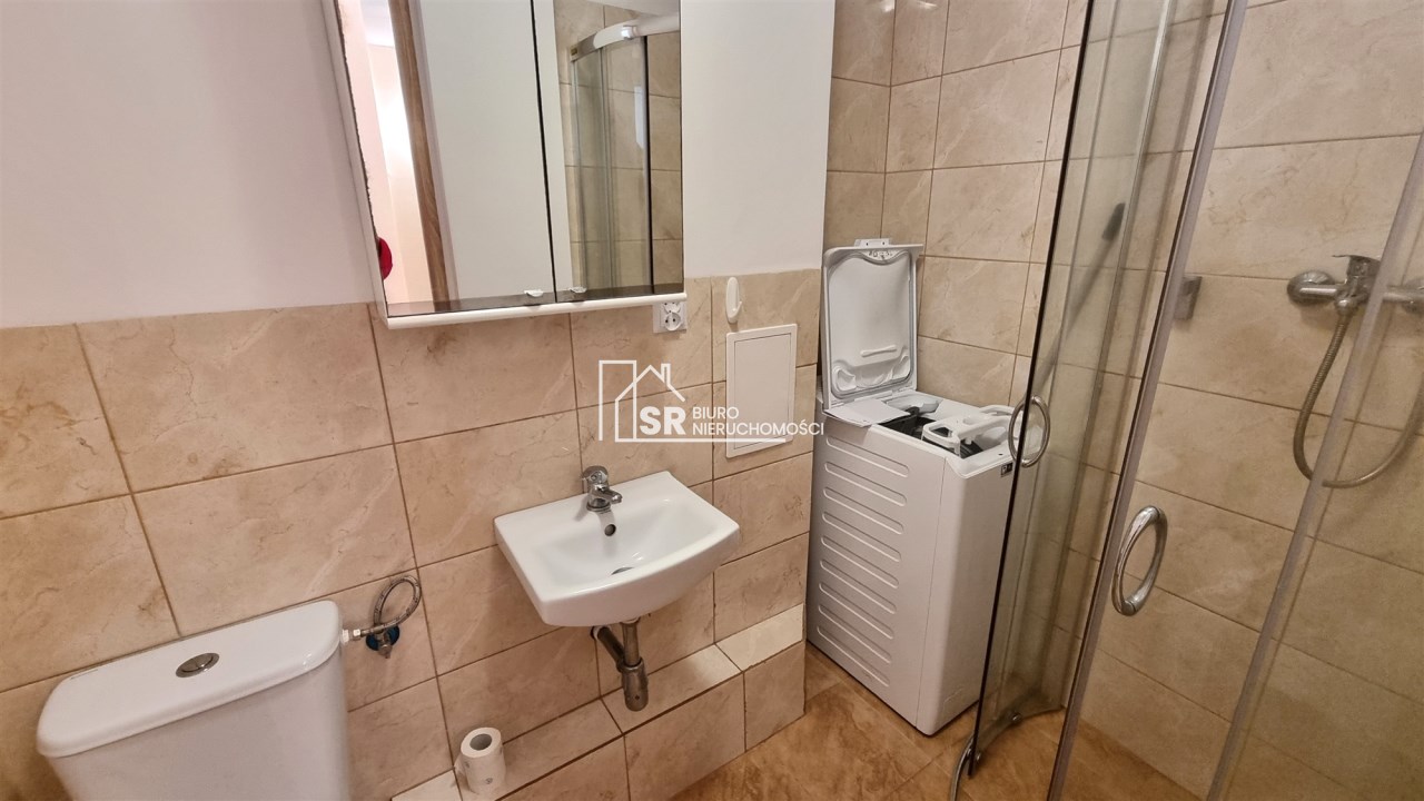 Wyposażenie łazienki kabina prysznicowa, lustro, pralka, umywalka, WC