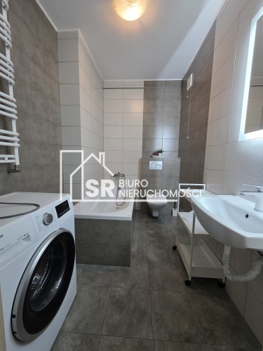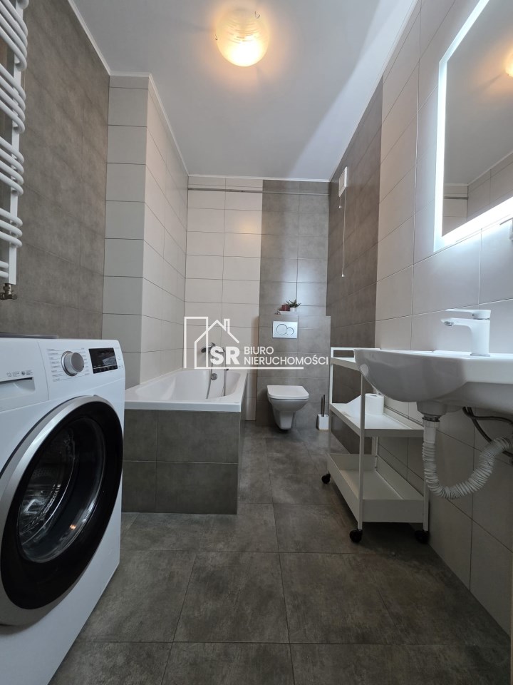 Łazienka wyposażona w wannę, umywalkę z szafką, wc podwieszane, pralkę oraz lustro.